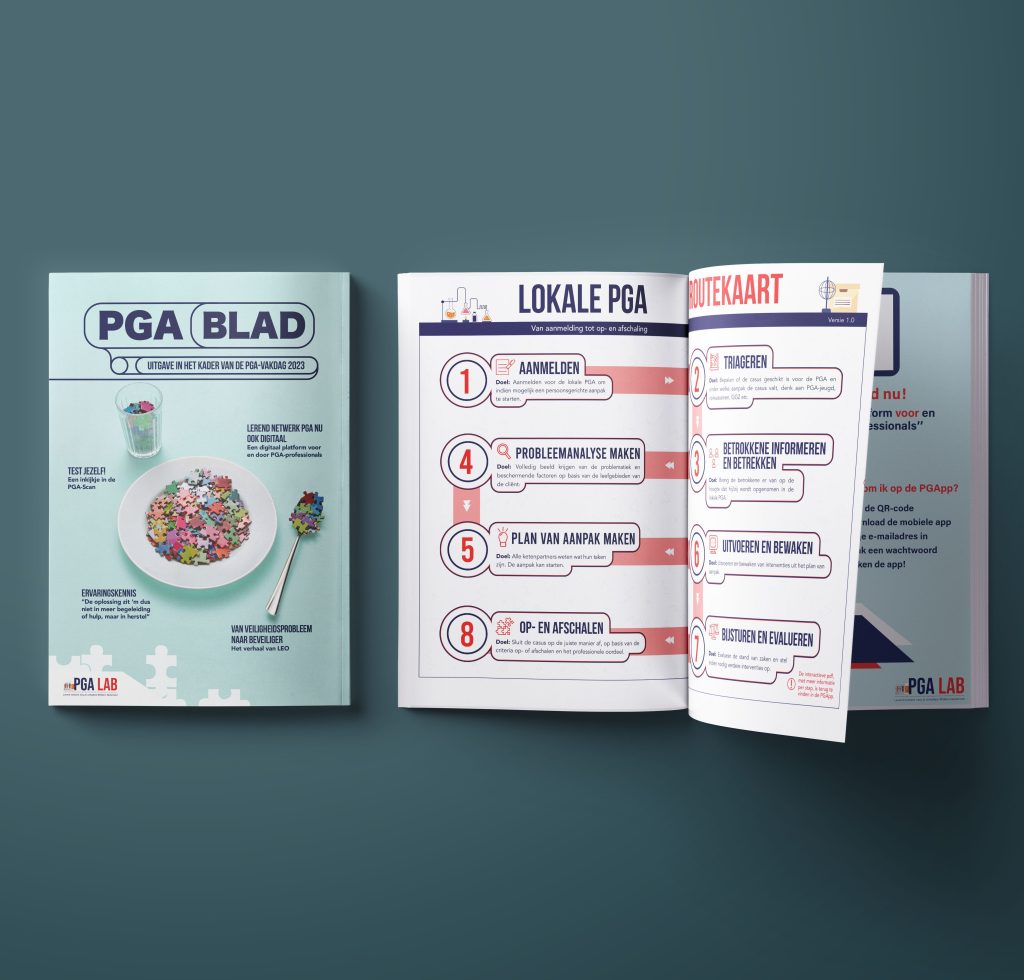 Om het PGA-proces inzichtelijk te maken voor belanghebbenden heb ik een uitvouwbaar 3-luik vormgegeven in de huisstijl van het Lab. Deze folder is opvouwbaar en op zakformaat zodat het makkelijk meegenomen en verspreid kan worden.